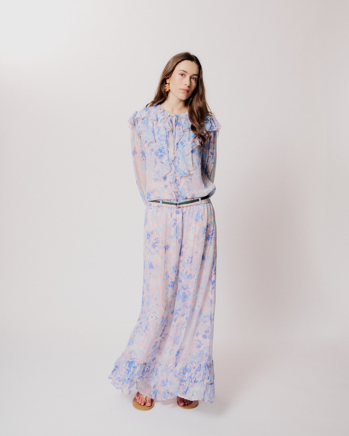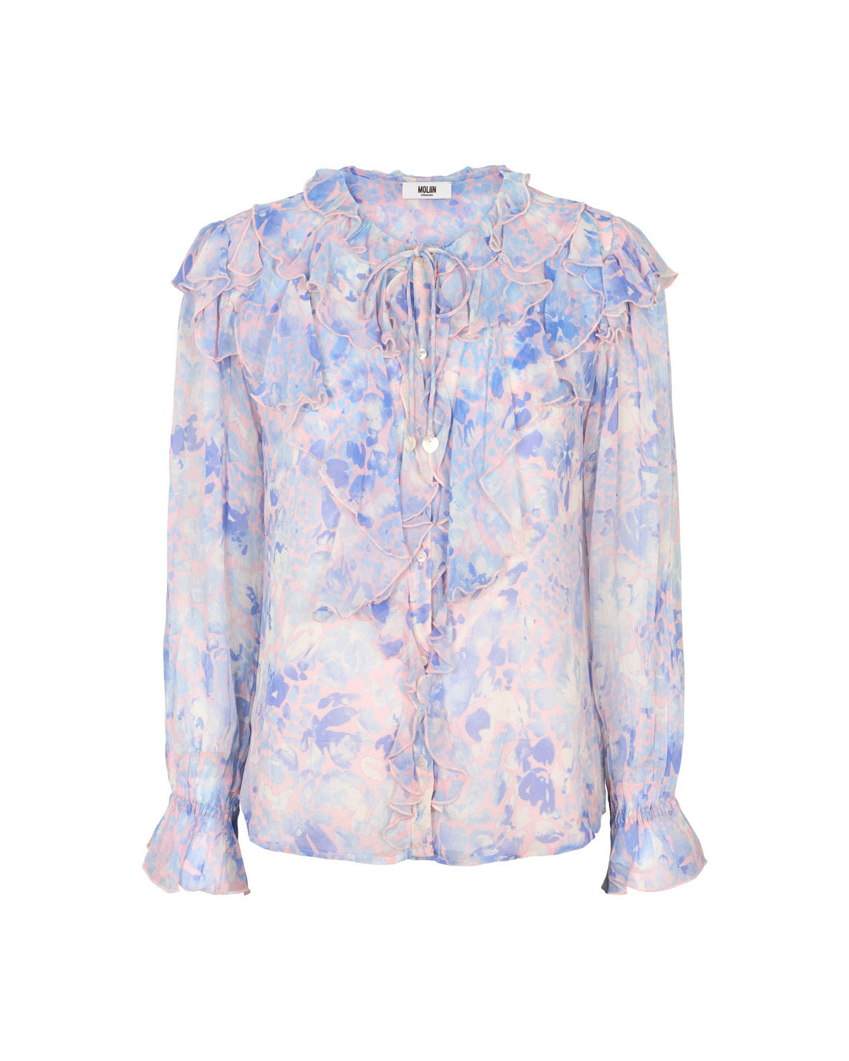 Helena Shirt is designed in a sheer quality with a romantic floral print. It features a round neckline with a delicate tie detail and ruffles along the neckline and front placket. The long sleeves have gentle volume and are finished with elasticated cuffs, adding soft structure. Helena Shirt can be paired with the matching Jeanette Skirt for a complete set.